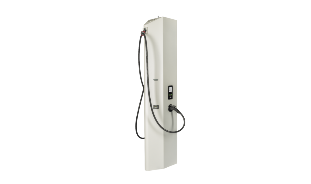This attractive, trapezium-shaped charger is perfectly suited for public usage. It can be used as a satellite charger in a connected loading network.